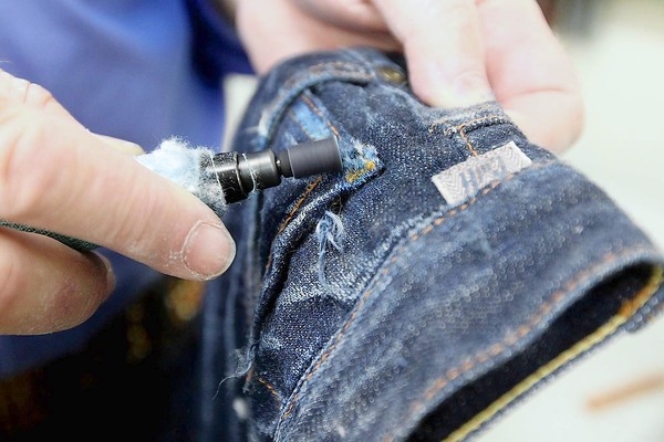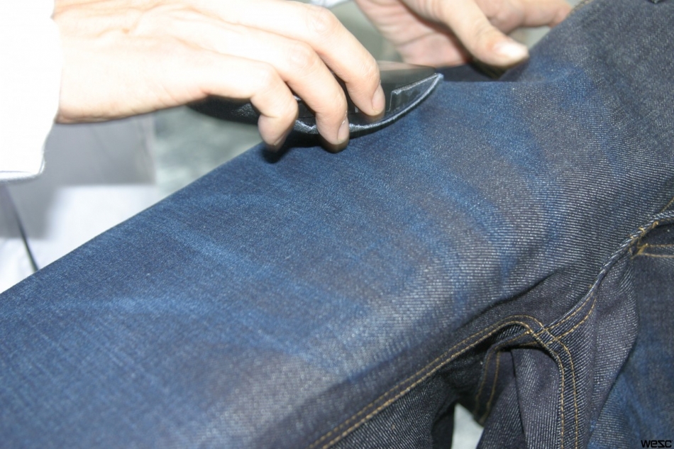 KILÇIK : Bu uygulama denim mamul ham halde iken yapılır. İstenilen bölgeye bu uygulama için tasarlanmış olan makine ile plastik kılçıklar zımbalanır. Uygulamadaki amaç zımbalanan bölgelerin yıkama esnasında uygulanan yıkama efektini almamasını sağlamaktır. Yıkama sonrası bu kılçıklar alındığında üründe yandaki resimde görülen efekt elde edilmiş olur.